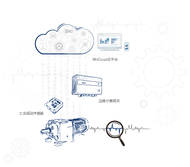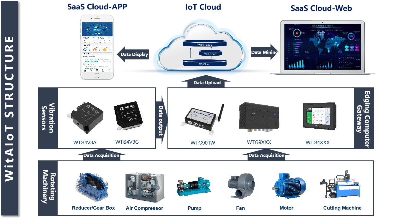 IoT high-frequency vibration sensor is used to collect vibration waveform samples and surface temperature of equipment to generate vibration characteristics of equipment. WTG9XXX edge computing gateway collects related machines' data to understand the load state of the motor in operation and the characteristics of the sensor, so as to realize the prediction of rotating equipment faults such as unbalanced, misaligned, loose, gear wear and bearing aging. Then the data and analysis results are uploaded to the WitCloud platform through MQTT System. SaaS cloud platform provides users with monitoring, management and other main operations. It also provides data interface function to facilitate users to import the standby state into the intelligent factory operation and maintenance platform system, which forms professional rotating machinery health diagnosis report and maintenance suggestions.