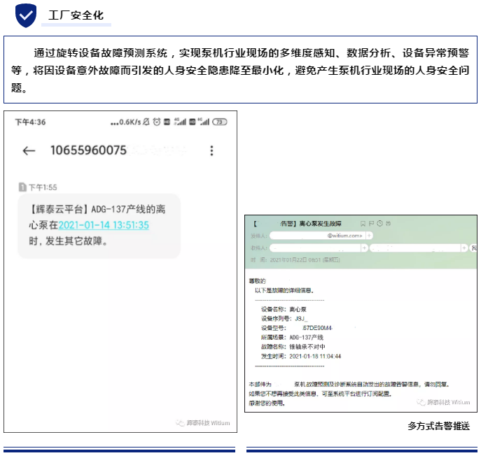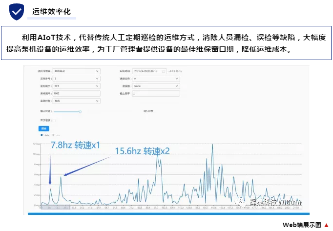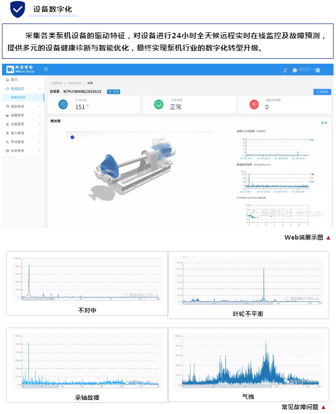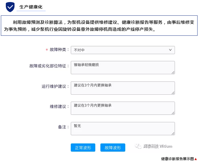 通過WTG9XXX邊緣計(jì)算網(wǎng)關(guān)對數(shù)據(jù)進(jìn)行分析,并把振動數(shù)據(jù)上傳到WitCloud物聯(lián)網(wǎng)數(shù)據(jù)云平臺,利用WitExpert上的特性樣本庫結(jié)合智能算法對數(shù)據(jù)進(jìn)行機(jī)器學(xué)習(xí),生成對應(yīng)的故障預(yù)測模型,該模型根據(jù)實(shí)時采集的振動數(shù)據(jù),最終反饋到WitRMSaaS用戶平臺,為用戶提供泵機(jī)現(xiàn)場相關(guān)設(shè)備的在線監(jiān)控、故障分析、維修建議、健康診斷報(bào)告等服務(wù)。