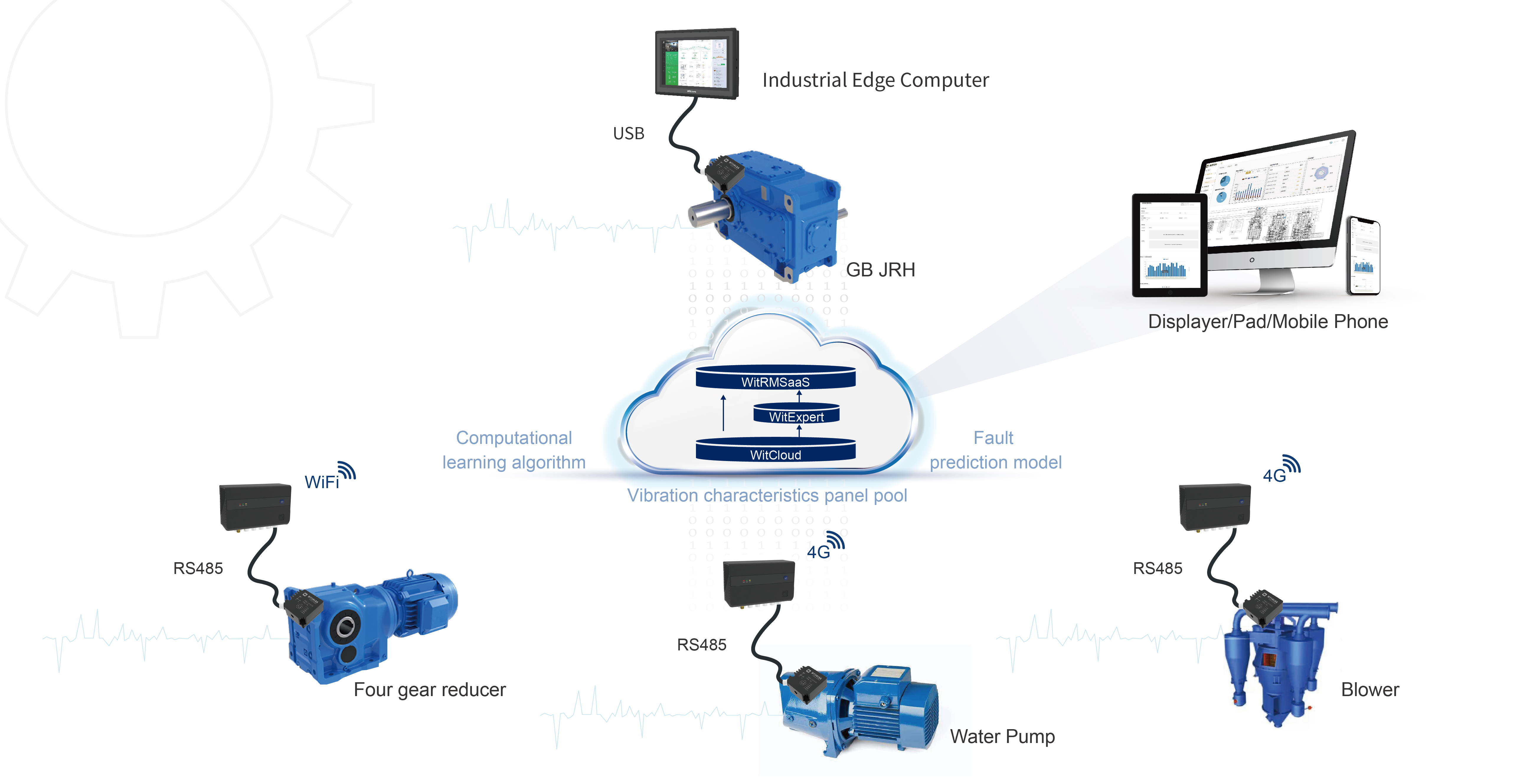 The functions of witcloud cloud platform include: access configuration of vibration sensor and edge computing gateway on reducer equipment (including subject configuration and channel configuration), remote information configuration and equipment firmware upgrade, alarm configuration, journal recording and viewing, multi-layer edge computing gateway upload, database backup and retrieval, management and control of influxdb database.