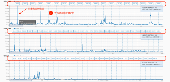如上方1.4-1與1.4-2兩張圖的對比,在頻譜分析界面中,新增了頻譜刻度尺自顯示的功能,雙擊后可以同時看到三軸(徑向水平/徑向垂直/軸向)的邊帶頻以及相關倍頻數(shù)據(jù)。